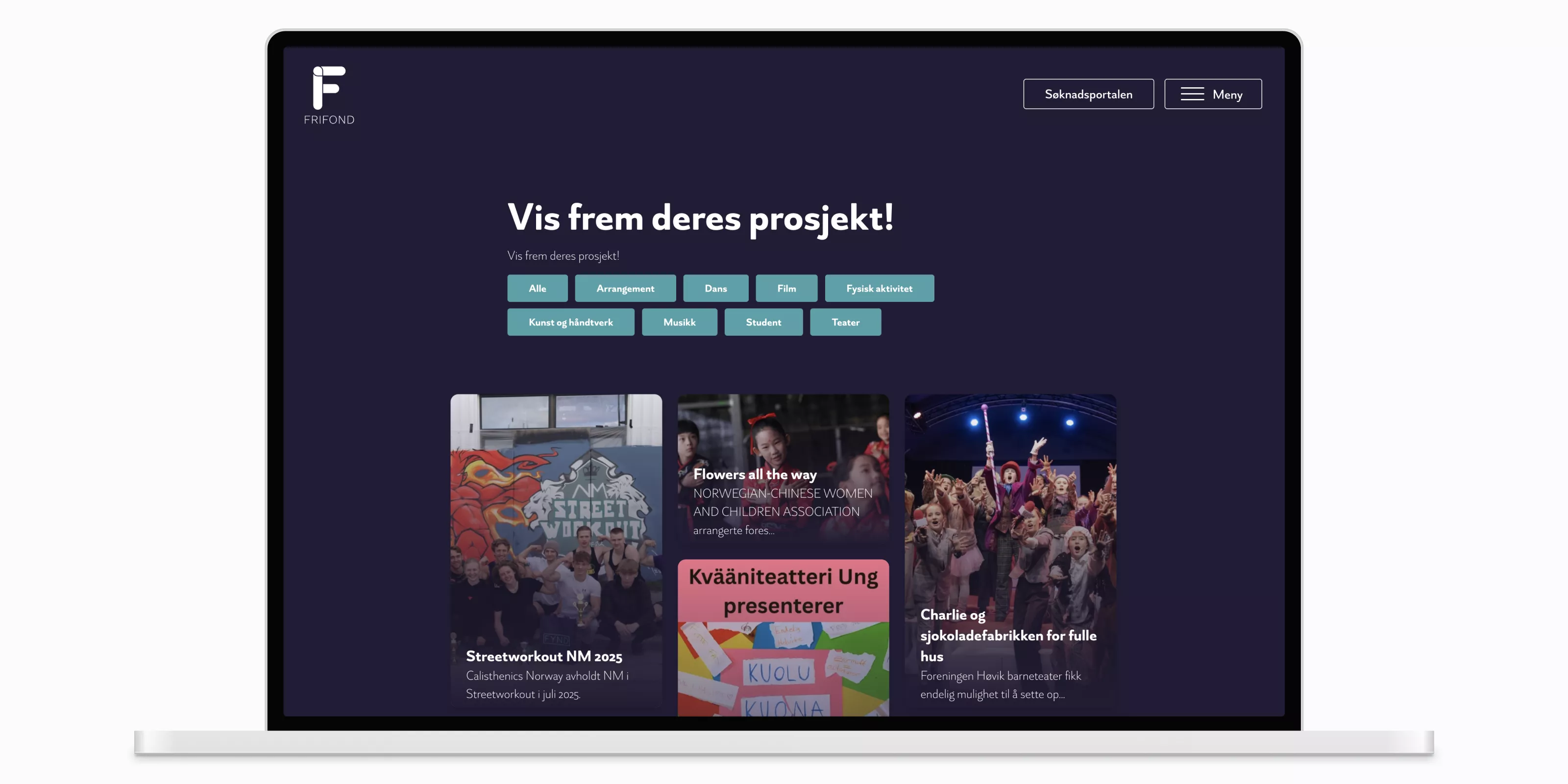 Frifond feirer i 2025 25 år, hadde behov for en fornyelse av profil og nettside. Både for bedre presentere støtteordninger, krav og trekke frem inspirererende prosjekter for å tiltrekke seg flere gode søknader og prosjekter.